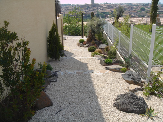 L’aspect de zone aride ou très sèche doit être créé : on y aménage donc des aires de graviers clairs ou foncés et des massifs en pouzzolane, des murets en pierres sèches, des bordures ou marches en traverses de chêne, de pierres ou de rocailles.